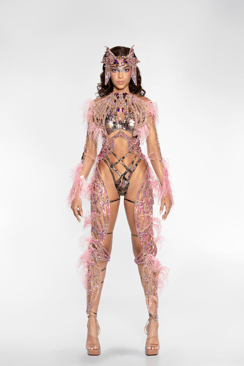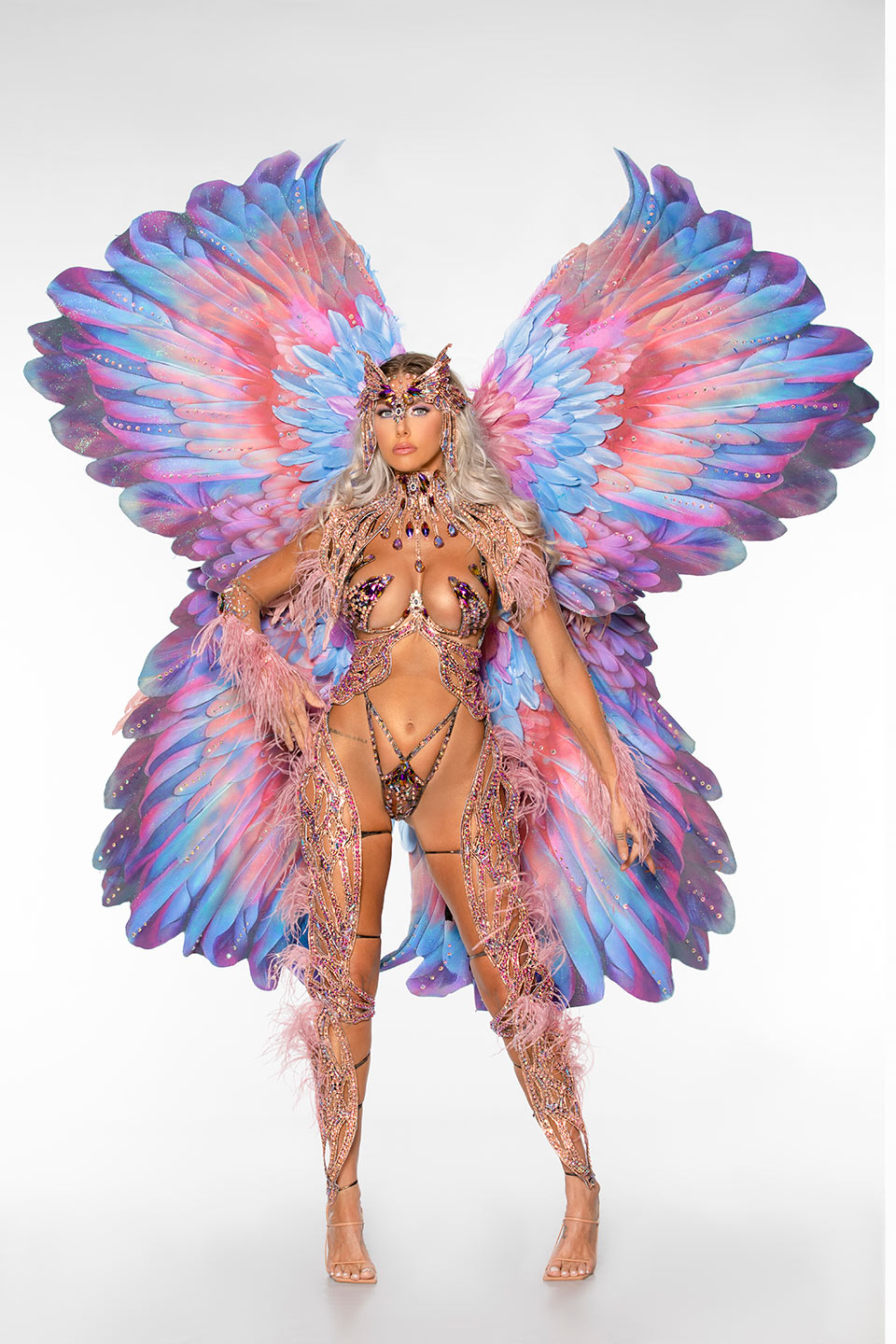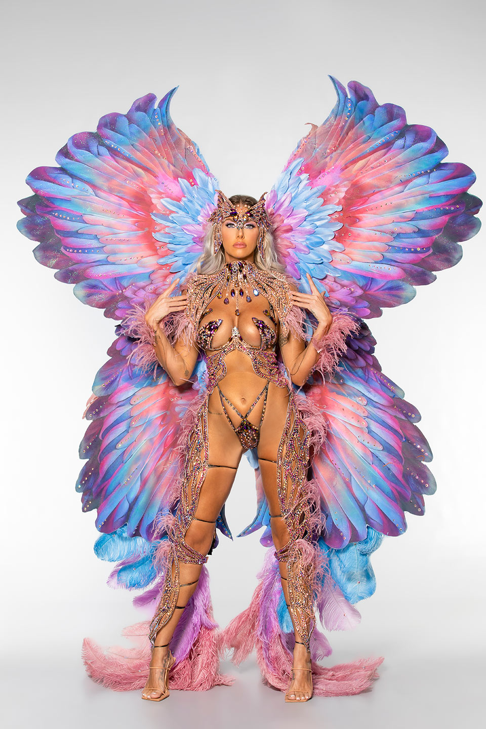 Includes Backline Bodywear (cut-out or full monokini), Crown, Feathered Neck, Feathered Sleeves, Waistband, Pair of Feathered Upper and Lower Legs and House of Bacchanal VIP Party Package